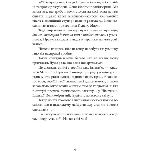 Спогади про рідну домівку, про рідне місто, рідні вулиці, рідних людей, про… У кожного героя, героїні свої спогади, які допомагають, а часом заважають жити новим життям, там, за кордоном. Жити в статусі прохача тимчасового захисту в Німеччині, Ірландії, Великобританії, Ізраїлі, по всьому світу. Тепер життя кожного з них наповнюється новими досвідами, що в недалекому майбутньому стануть новими спогадами.