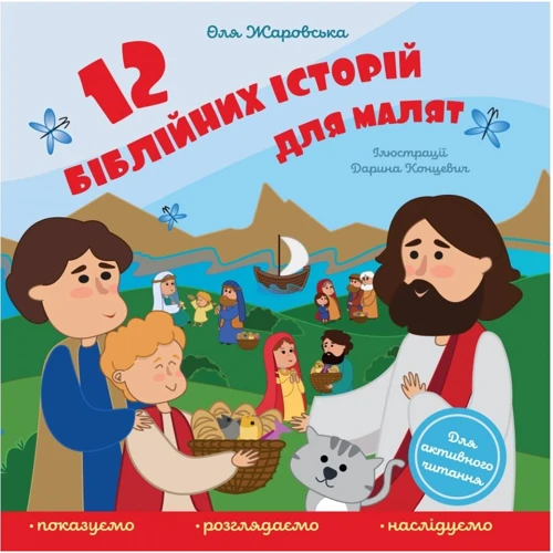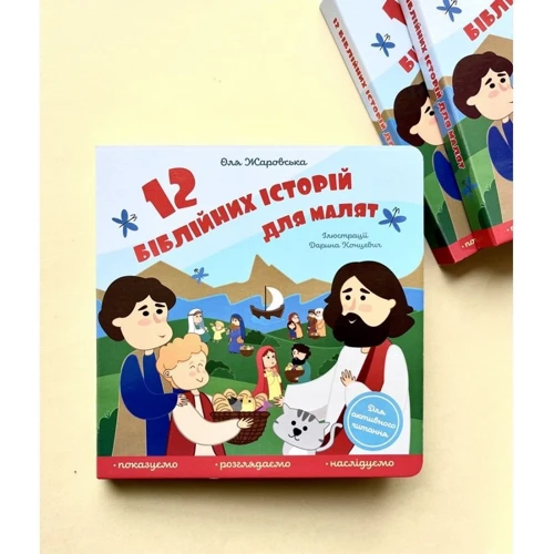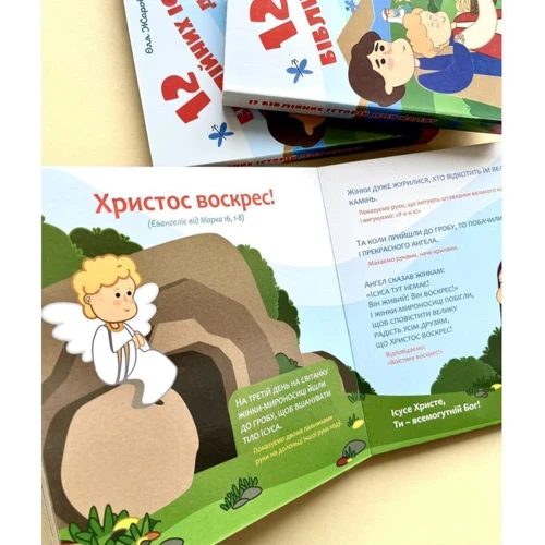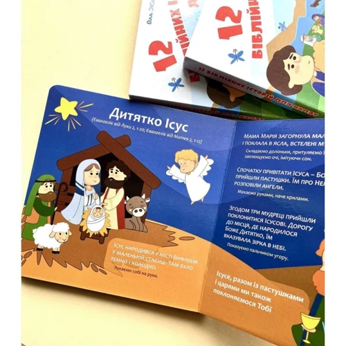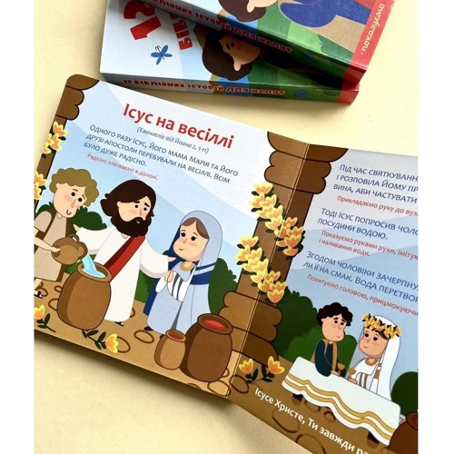 Ця книжка-картонка для найменших читачів з елементами інтерактиву. Використовуючи вміння малюків повторювати певні рухи, жести, розповідаємо про життя Ісуса та Богородиці. Гра, рух, повторення зацікавлюють і сприяють запам’ятовуванню.