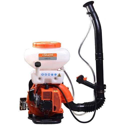 Бензиновий обприскувач Sturm GS8213G підходить для широкого спектру робіт і об'єднує в собі кращі технічні характеристики. Sturm GS8213G призначений для обприскування зелених насаджень спеціальними складами, поверхневими добривами і засобами проти комах. За допомогою бензооприскувача також можна розпорошувати сипучі речовини і речовини в гранулах, до яких відносяться і мінеральні добрива. Конструкція мотообприскувача передбачає створення додаткового тиску в баку з хімікатами, що дозволяє обробляти більш високі дерева, незважаючи на кількість рідини, що залишилась в баку. Містка ємність - 13 л, передбачає тривалу роботу з розпилення, близько 6-7 годин. На одній заправці контейнера можна обробити дуже великі простори. Після закінчення роботи бак легко омивається чистою проточною водою.
