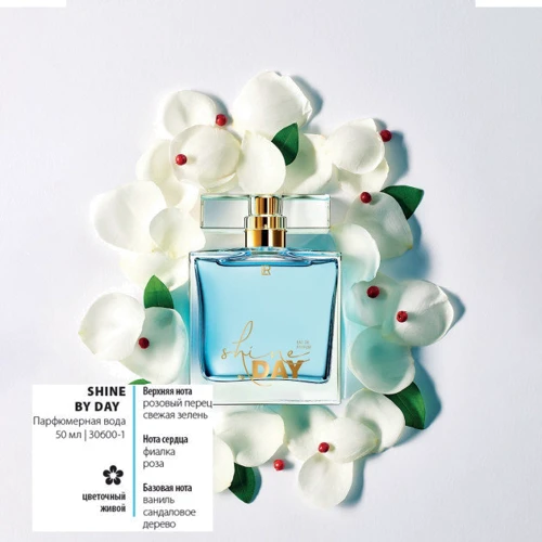 Парфумована вода LR Health and Beauty LR Shine by Day - це найбажаніший подарунок для будь-якої дівчини, жінки. Він насичений ваніллю, яка приправлена перцем і сандаловим деревом. Він справляє враження вже з першого вдиху, тому всі, хто ним користується, незмінно привертають увагу оточуючих. Насичений, але в той же час дуже тонкий, він доречний в будь-якій ситуації, тому використовувати його можна як перед походом на роботу, так і в якості фінальної ноти для вечірнього образу.