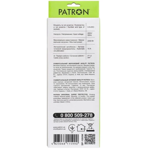 Фільтр мережі Patron призначений для підключення широкого спектру побутової та комп'ютерної техніки. Фільтр має універсальні розетки типу "євро" із заземленням та захищає електронну техніку від короткого замикання, перепадів напруги та імпульсних перешкод.