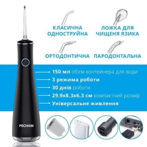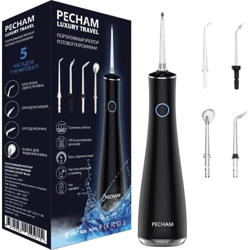 Іригатор PECHAM Luxury Travel Black оснащується п'ятьма насадками, має три режими подачі води. Завдяки цьому можна комбінувати догляд, виконуючи: