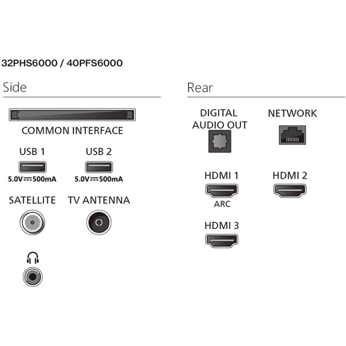 Роз'єми На корпусі телевізора є порти, що дозволяють підключати до нього різні гаджети. Порт HDMI використовується для підключення ноутбука, USB-роз'єм призначений для підключення флешки. | Ethernet, USB, HDMI |
