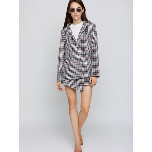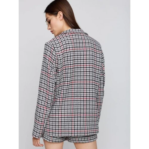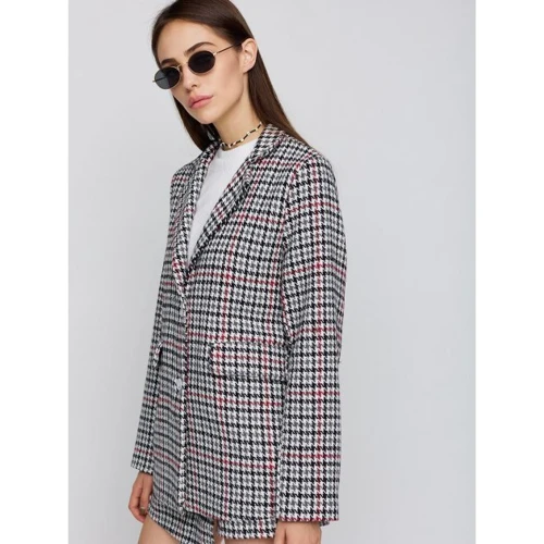 Прямий однобортний фасон, V-подібний виріз, англійський комір, застібка на ґудзики, прорізні кишені з клапаном, модель з підкладкою з софта.