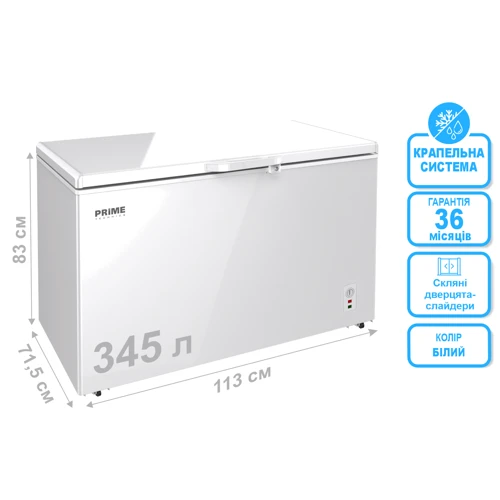Морозильна скриня Prime Technics CS 34528 MG – це надійний та місткий пристрій для зберігання великої кількості продуктів. Він має загальний об'єм 345 літрів, що дає змогу зберігати значну кількість заморожених продуктів. Корисний об'єм морозильної камери становить 337 літрів, що забезпечує достатньо місця для зберігання.