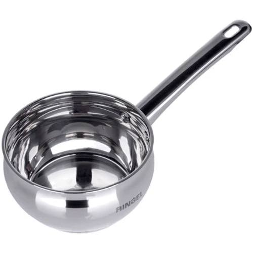 # Тришарове капсульне дно У конструкції ковша Ringel застосована спеціальна товста алюмінієва пластина, герметично запаяна всередині капсуля з нержавіючої сталі. Таке рішення дозволяє ковшу швидше нагрівається і краще розподіляє тепло по всій поверхні, адже алюміній має підвищену в порівнянні зі сталлю теплопровідністю. Завдяки цьому приготування їжі займає менше часу, що дозволяє заощадити як енергію, так і час.