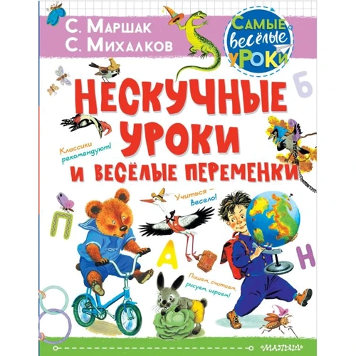 Книга «Ненудні уроки та веселі перерви» складається з кількох розділів: «Вчимо літери», «Вважаємо», «Граємо», «Світ навколо нас» та «Малюємо». У кожній частині дитині пропонується прочитати вірші С. Маршака та С. Михалкова та познайомитися з літерами, цифрами, пори року, навчитися малювати. На кожній сторінці на хлопців чекають цікаві завдання. Вчитися із класиками дитячої літератури дуже цікаво!