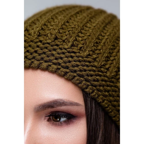 Шапка виконана об'ємною фактурною в'язкою. Завдяки наявності вовни у складі виріб чудово зберігає тепло, акрил додає зносостійкості, еластан – еластичності.