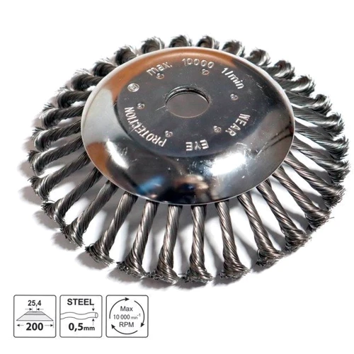 Щітка зручно використовувати в місцях стиків бордюр або цегляної кладки. Діаметр насадки складає 200 мм. Діаметр посадкового отвору для кріплення щітки становить 25.4 мм, тому вона підійде до всіх стандартних тримерів та мотокосів. Щітка легко кріпиться і легко знімається.