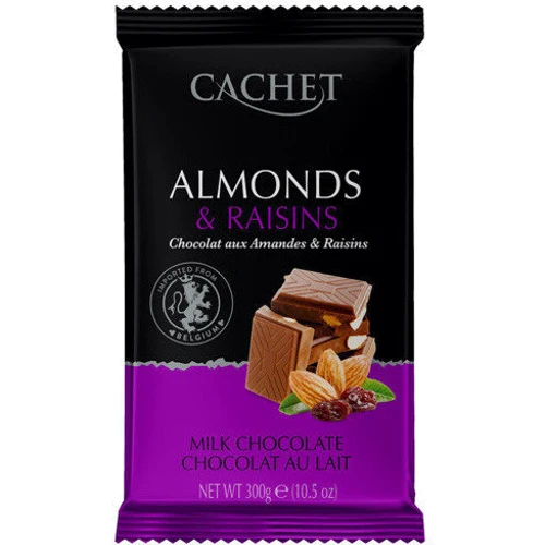 Cachet Almonds & Raisins - чудовий бельгійський шоколад преміум-класу з вишуканим поєднанням мигдального горіха та родзинок. Ніжний смак чудового молочного шоколаду наповнений барвистим поєднанням горіхів та родзинок та поєднує в собі одночасно сенсацію та вишуканість. Спробуйте чудовий молочний шоколад з горіхами і родзинками і відчуєте всю симфонію смаків, який безсумнівно принесе незабутні відчуття і захоплення.