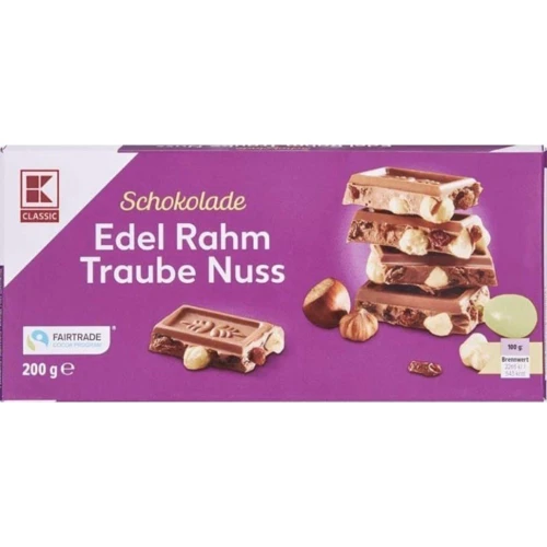 Шоколад Edel Rahm Nuss (Німеччина) 200g - це чудовий молочний шоколад з великим вмістом цільних лісових хрустких горіхів і родзинок. До складу шоколаду входять тільки натуральні компоненти.