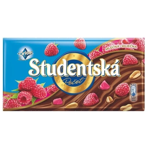 Studentska молочний з малиною, 180 г-неймовірно смачний молочний шоколад з арахісом і шматочками малини. Виготовлений в Чехії виробником європейської якості Orion, проводиться з 1975 року відповідно до традиційної рецептурою.
