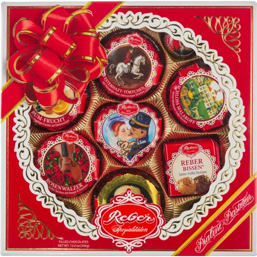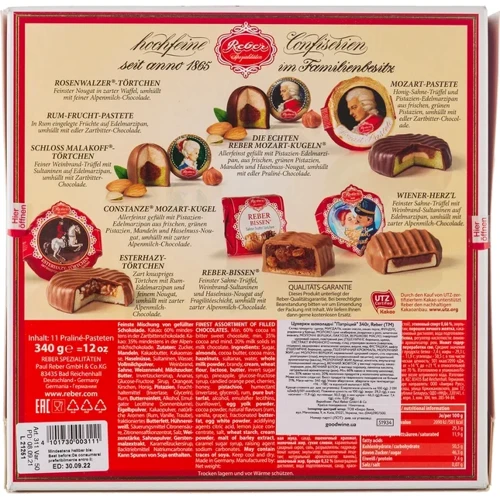 цукор, мигдаль, какао-масло, какао терте, лісові горіхи, кисломолочні горіхи, вода, незбиране сухе молоко, коньяк, вершки, пшеничне борошно, лактоза, вершкове масло, інвертний цукровий сироп, ананас, глюкозно-фруктозний сироп, цедра апельсина, вишня, мед, фісташки, зволожувачі (інвертаза, гліцерин), ром, вершковий жир, спирт, емульгатор лецитин (соняшник), яєчний жовток порошок, какао-порошок, натуральні ароматизатори (ром, ваніль, виноград), вершковий жир фракціонований, яєчний білок, підкислювач лимонна кислота, концентрат лимонного соку, сіль, пшеничний крохмаль, порошкові вершки, екстракт ячмінного солоду, карамельний цукровий сироп, розпушувач карбонат натрію. Какао: мінімум 60% у темному шоколаді. Какао: не менше 35% в альпійському молочному шоколаді.
