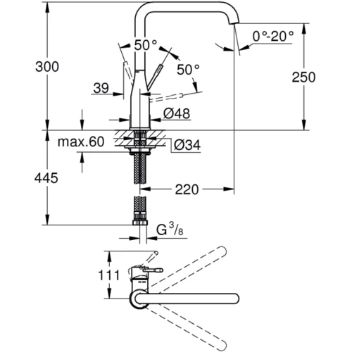 Особливості: Високий вилив, GROHE SilkMove керамічний картридж 28 мм, аератор, Поворотний трубкоподібний вилив, Регульований діапазон поворт 0, 150 або 360 градусів, гнучка підводка, система швидкого монтажу, Вбудований обмежувач температури, Мінімальний тиск 1,0 бар Колекція: Essence Кількість отворів: Один