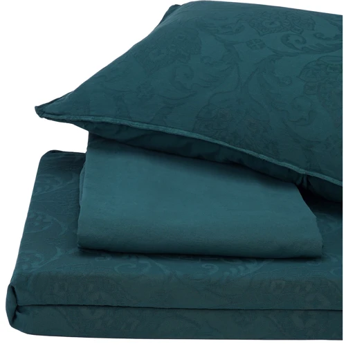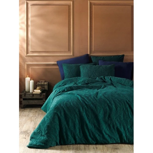 Комплект постільної білизни Stonewash Jakard Dark green SoundSleep євро - вишукана темно-зелена білизна з жакардовим, фактурним малюнком в тон зшита з сатин-жаккардової тканини з ефектом потертостей і штучного старіння Stonewash. Тканина дуже м'яка на дотик, фактурна, за рахунок візерункового жакардового плетіння ниток, не мнеться.