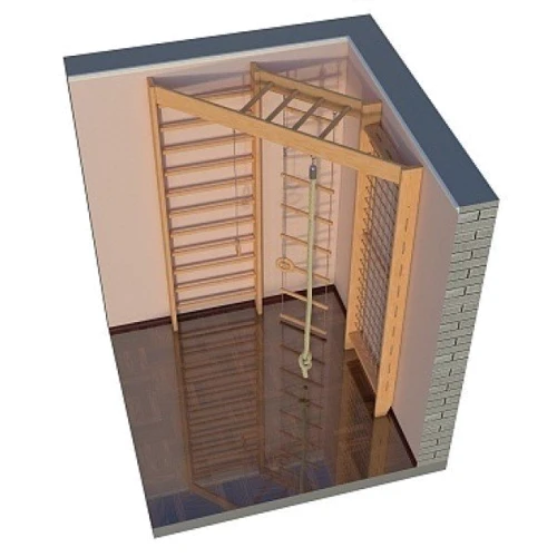 Каркас дитячі спортивної стінки "Baby 4 - 240" створений у вигляді багатокутника, що складається з трьох опорних стійок, дві з яких являють собою секції спортивного обладнання-гладіаторську сітку і шведську стінку. У верхній частині стінки розміщений рукохід, одночасно службовець кріпленням для навісного обладнання - каната, гімнастичних кілець і трапеції, мотузкових сходів.