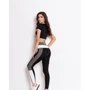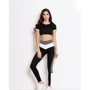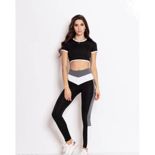 Спортивний костюм для фітнесу з білими анатомічними вставками на легінсах. Кроп-топ чорного кольору з короткими рукавами, напівкруглою проймою горловини і білими бейками на зрізах. Легінси облягаючого комфортного крою з високою посадкою і високою еластичністю.
