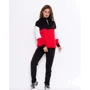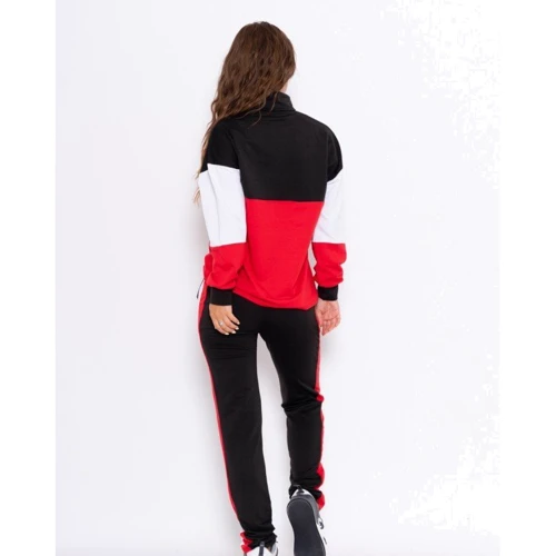 Чорно-червоний з білими вставками спортивний костюм з трикотажної двухніті. Верхня частина прямого крою з довгими рукавами на манжетах і коміром-стійкою з блискавкою спереду. Штани прямого крою з боковими кишенями та еластичною поясною гумкою.