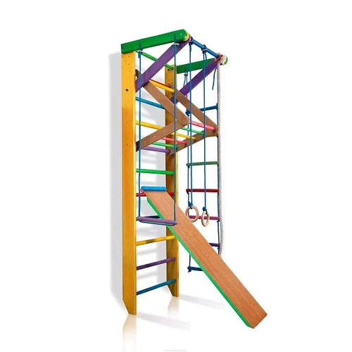 Опис Спортивний куточок «Юнга 3-220» Дитячий спортивний куточок «Юнга 3-220» - модель, що включає в себе найголовніші спортивні елементи, такі як шведська стінка, гімнастичні кільця, дошка для преса, мотузкові сходи і канат. Лазити по даній конструкції, Ваш малюк буде чудово масажувати стопи своїх ніжок, тому, зможе уникнути і плоскостопості, якому, на жаль, на сьогоднішній день схильні багато діток. Займаючись на даній конструкції, Ваша дитина також зможе тренувати м'язи плечового пояса і рук, стане більш спритним, витривалим і сильним. Магазин пропонує придбати куточок «Юнга 3-220» по абсолютно доступною ціною.
