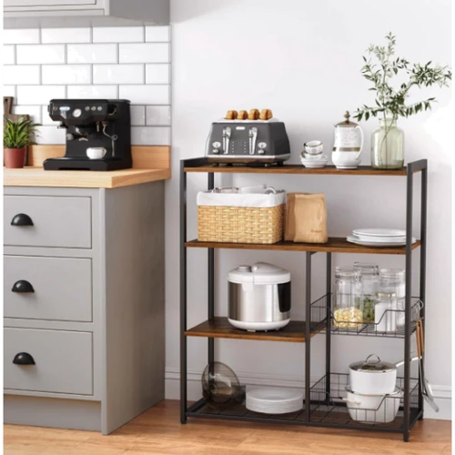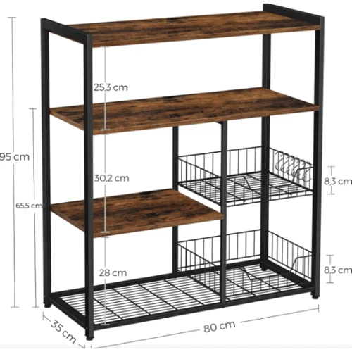 Багатоярусний дизайн стелажу Leobert дозволяє максимально ефективно використовувати вертикальний простір. З різною відстанню між полицями цей стелаж дозволяє зберігати предмети різних розмірів і ваги, забезпечуючи при цьому зручний доступ до всього необхідного. Кожна полиця витримує навантаження до 20 кг, а дротяний кошик – до 10 кг.