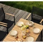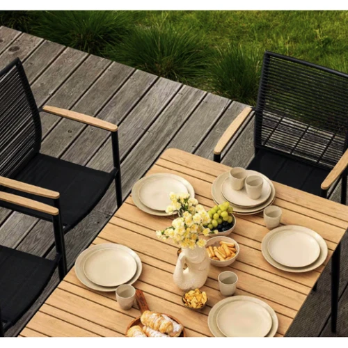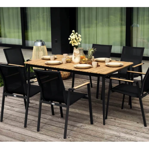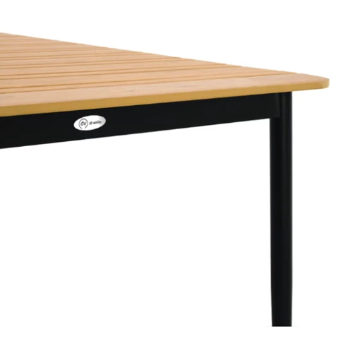 Конструкція прямокутного столу для тераси виготовлена із чорного фарбованого алюмінію з матовим покриттям. Алюміній характеризується високою міцністю, стійкістю до корозії, вологи і погодним умовам, що змінюються, що робить його ідеальним матеріалом для виготовлення садових меблів. Додатковою перевагою алюмінієвої конструкції є її легкість, що полегшує переміщення столу та зміну його налаштування.