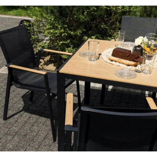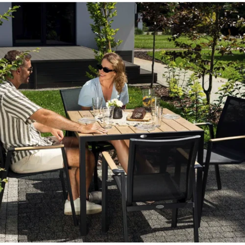 Конструкція столу для тераси Pesaro виготовлена з легкого але міцного алюмінію, пофарбованого в чорний колір. Завдяки цьому стіл легко переміщати, що особливо корисно при зміні розташування та перестановці садових меблів залежно від ваших потреб чи погоди. Алюміній також стійкий до корозії, що забезпечує довговічність столу та стійкість до несприятливого впливу вологи.