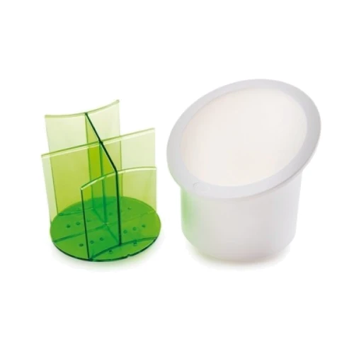 Компактна сушка для столових приладів виготовлена з якісної харчової пластмаси, має гладкі блискучі стінки і насичені цвета. Має поділ для того, щоб ставити роздільно столові прилади.