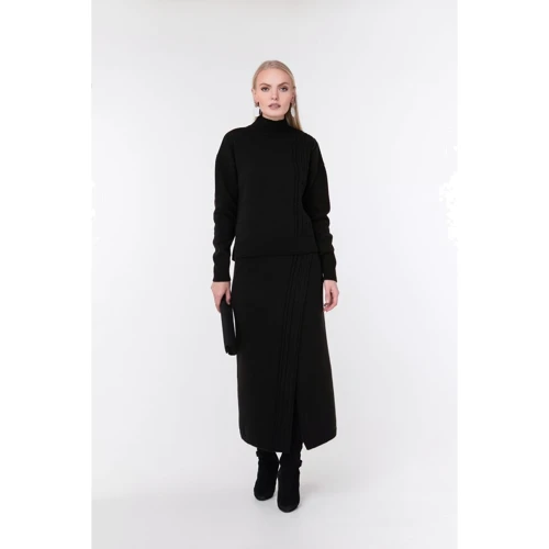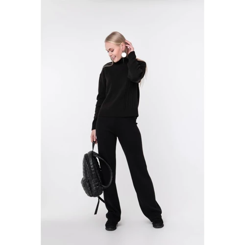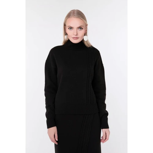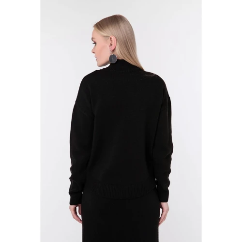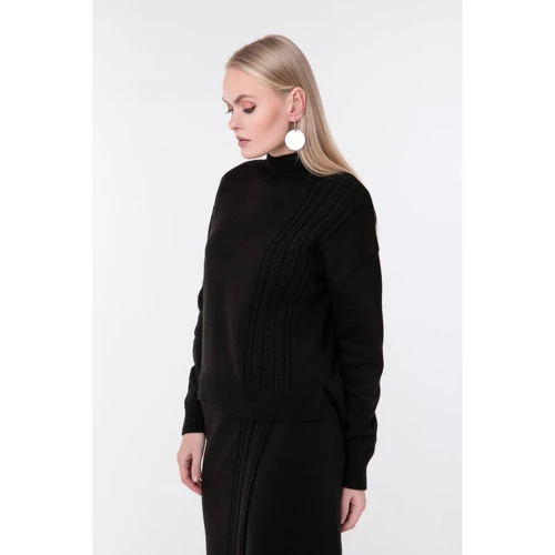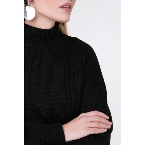 Светр з візерунком "коси". Виріб виконаний з м'якої, теплої пряжі зі стрейчевим ефектом. Довгі широкі рукави. Силует вільний, прямий. Низ виробу, горловина і рукава оздоблені щільною гумкою.
