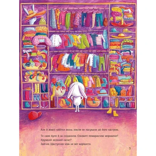 Зайчик Щастунчик зовсім не радий. Щодня йому доводиться вирішувати, що вдягти, з ким гратися й чим поласувати. Тому Щастунчик вигадує, що відтепер ухвалювати всі рішення за нього має колесо фортуни: синій колір на користь синього шалика, лохини на обід і веселощів із павичем. Зелений — на користь зелених штанців, соковитої трави на перекус і стрибків наввипередки з коником. Але чи щасливий тепер Щастунчик? Він чекає, щоб випав помаранчевий! Адже тоді нарешті буде морква й можливість пограти у футбол із білочкою.