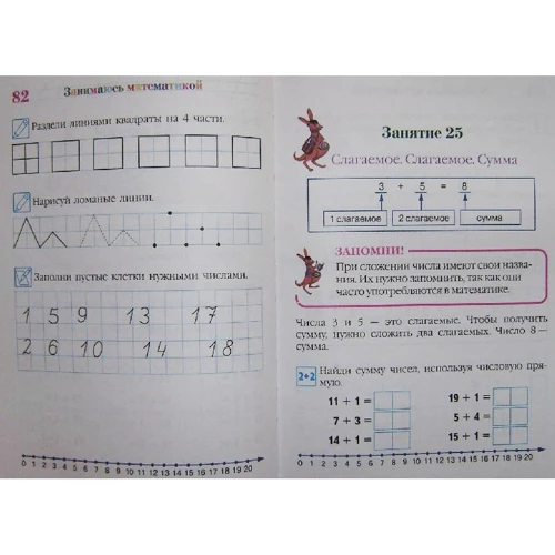 Основні завдання посібника - ознайомлення дитини з математичними поняттями "доданок", "сума", "зменшуване", "віднімається", "різниця", "однозначні/двозначні числа", "парні/непарні числа" та навчання рахунку десятками, позначення кутів і сторін геометричних фігур, формування уявлень про об'ємні фігури.