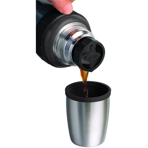 Термос оснащений висувною прогумованою ручкою для зручного транспортування, а також повнорозмірною чашкою, що одночасно виконує роль кришки.