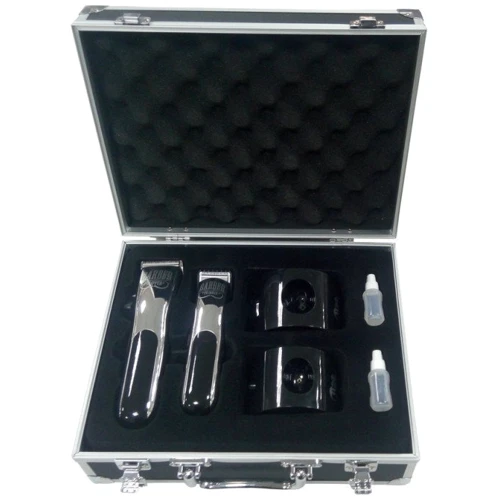 Аксесуари | Машинка, триммер, адаптер живлення, база для зарядки, олія та щіточка, 4 насадки для стрижки (3, 6, 9 та 12 мм), олія, щіточка, універсальна насадка для стрижки 3 – 7 мм., кейс |