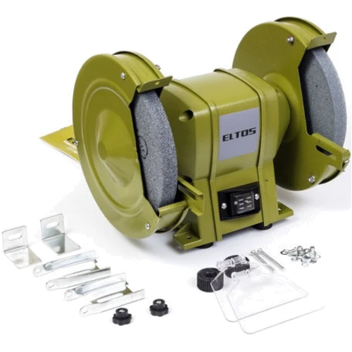 Універсальний прилад, що дозволяє проводити заточування лез (ножів, сокири і т.д.), видалення задирок і зняття фасок. Досить висока потужність асинхронного двигуна в 1100 Вт дозволяє розвивати швидкість до 2950 об/хв. На таке обладнання підходять диски до 200 мм в діаметрі і до 20 мм в товщину. Цей точильний верстат для ножів та інших аксесуарів обладнаний металевими захисними кожухами, що прикривають диски з усіх боків. Це дозволяє убезпечити як саме обладнання, так і користувача. Порадує і протекція від іскор. Для цього точило Eltos ТЕ-200 укомплектоване прозорими щитками, які легко встановлювати під зручним нахилом. Елтос ТЕ-200 - відмінні побутові точильні верстати, що виділяються зручністю під час експлуатації. Вони працюють тихо, а прогумовані вставки пригнічують зайві вібрації. Міцна опорна пластина добре підтримує заготовку, що позитивно впливає на точність обробки.