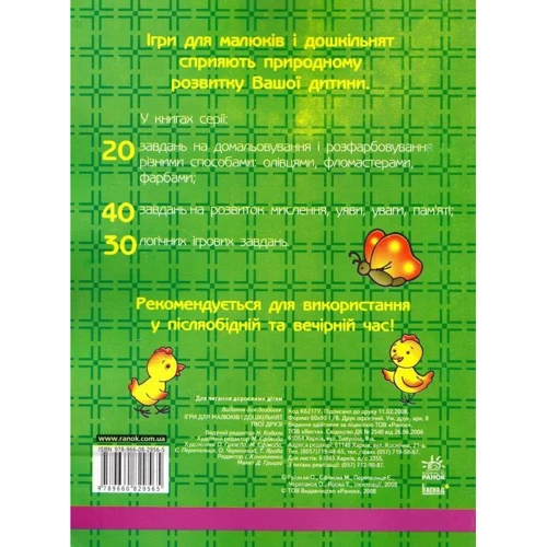 Книги серії укладено таким чином, щоб дитині було цікаво й легко виконувати завдання навіть без допомоги дорослого. Вправи охоплюють різні види роботи: малювання, розфарбовування, письмо, лічбу, рахування, та сприяють тренуванню різноманітних психологічних процесів: пам’яті, мислення, уяви, уваги. Уміщені завдання на перший погляд нескладні, та насправді у цьому їх перевага: дорослому не потрібно витрачати час на додаткову роботу для пояснювання, а дитина не нудиться і не сприймає ігрове навчання як незрозумілу повинність.