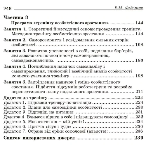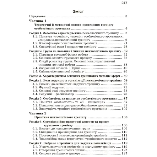 У навчальному посібнику систематизовано теоретичний і практичний досвід (частина І і ІІ) проведення тренінгу особистісного зростання, спрямованого на самооцінку, самопізнання, самоприйняття, самовдосконалення, саморозвиток особистості. Крім теоретичного матеріалу для підвищення психологічної грамотності з групових форм роботи, в посібнику подана орієнтовна програма «Тренінгу особистісного зростання» (частина ІІІ), наповнена різними вправами, іграми, психотехніками, які розраховані на його засвоєння і практичне використання. Матеріали можна успішно використовувати для проведення тренінгу або окремих практичних занять з особистісного зростання.