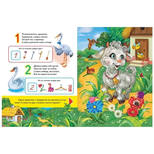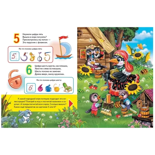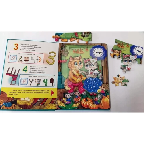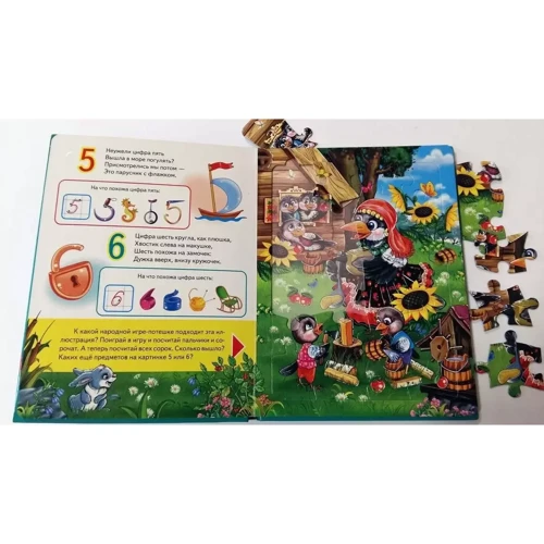 Дана книга-іграшка допоможе вашому малюкові познайомитися з цифрами. Так само в даній книзі запропоновані завдання з логікою, за допомогою яких можна розвивати не тільки увагу, але і математичні здібності, пам'ять і уява, і 6 великих пазлів. До кожної цифрі є невеликий віршик, який допоможе малюкові розвивати мову і пам'ять.