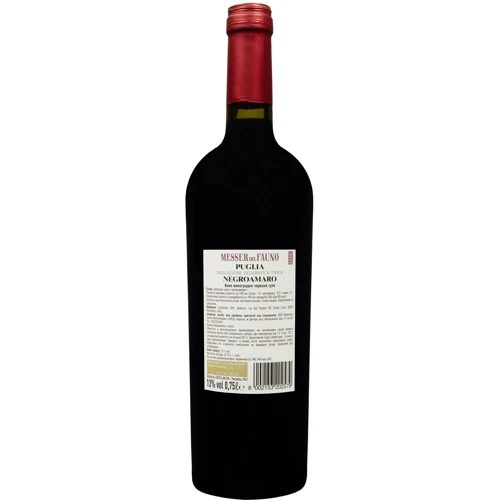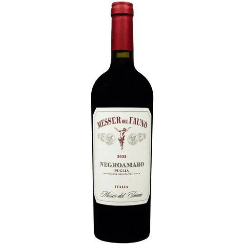 Вино Messer del Fauno Puglia IGT Negroamaro - червоне сухе вино Пулії, що складається на 100% винограду сорту Негроамаро, який є автохтонним для даного регіону. Масерія дель Фауно Негроамаро - виразний і яскравий напій з південним характером, як, втім, і вся лінійка вин Masseria del Fauno. Вино має насичений гранатовий колір, бархатистий і повний смак з пряними фруктовими нотками і тривалим післясмаком з мотивами свіжих ягід. Аромат напою має вишнево-сливові акценти.