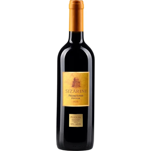 Вино Sizarini Primitivo Puglia IGT інтенсивного червоного кольору з фіолетовими відтінками. В ароматі відчуваються ноти шовковиці, вишні, тону фіалки, лакриці, горіхів та чорного перцю. Смак насичений, танінний із тривалим післясмаком.