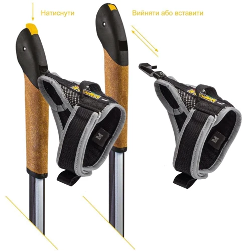 Асиметричні темляки Nordic Power з дихаючого гіпоалергенного неопрена ідеально фіксують руку, дозволяючи Вам відштовхуватися, дозоляючи не стискати рукоятку палиці. При необхідності можна моментально звільнити руку від палиці, завдяки системі швидкого звільнення Top-Click.
