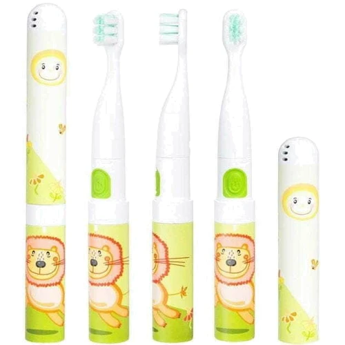 Звукова зубна щітка має невелику вагу, а її розмір та захисний ковпачок дозволяють легко та безпечно транспортувати її. Крім того, в комплекті із зубною щіткою поставляється металевий футляр із милим казковим малюнком, в який можна запакувати зубну щітку та пасту, щоб вони були з дитиною. Зубна щітка працює на батарейках, які можна замінити будь-якої миті, вдома або в дорозі.