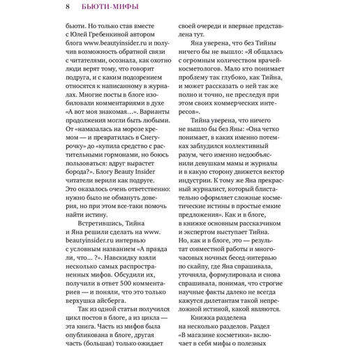 Сучасна дівчина будь-якого віку розуміє, що важливо ретельно стежити за своєю зовнішністю. Але як зорієнтуватися в дрімучому лісі незрозумілих термінів, гучних рекламних обіцянок, бабусиних секретів, маминих порад, подружкіной Лайфхак і всезнаючих інтернет-форумів? Найшвидший і бюджетний спосіб - прочитати цю книгу. Її автори, авторитетний лікар-косметолог Тійна Орасмяе-Медер і відомий журналіст Яна Зубцова, оголосили б'юті-міфам війну! З наукових позицій вони розповідають про корисні і шкідливих інгредієнтах зі складними назвами; пояснюють, чи може виникнути алергія на крем, якщо на ньому написано "гіпоалергенний"; чи завжди дорогі креми краще бюджетних і навіть викликають заняття бігом поява нових зморшок і чи варто фарбуватися, коли йдеш в спортзал, - і розвінчується ще безліч міфів, якими пройнята вся, що пов'язане з доглядом за собою.