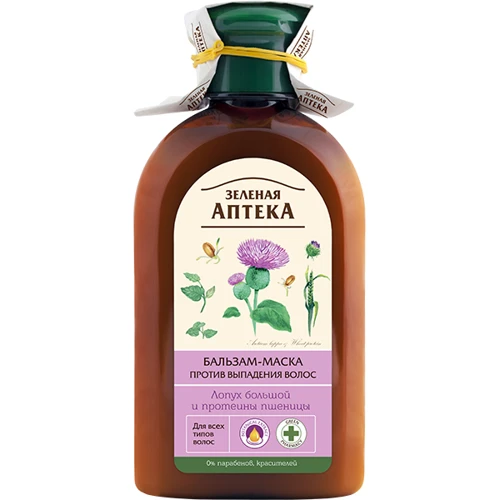 Якщо на гребінці ви все частіше помічаєте велику кількість волосся, необхідно вживати термінових заходів. Вкрай важливо оперативно підібрати косметичний засіб, який проведе лікування шкіри голови та волосся. Зверніть увагу на запропонований бальзам-маску. Як відомо, всі засоби марки «Зелена аптека» розроблені за найкращими фармацевтичними рецептами, яким можна довіряти. Цей бальзам-маска відрізняється своїм цілющим складом. У нього включені вітамін Е, лопуха великого та протеїни паростків пшениці.