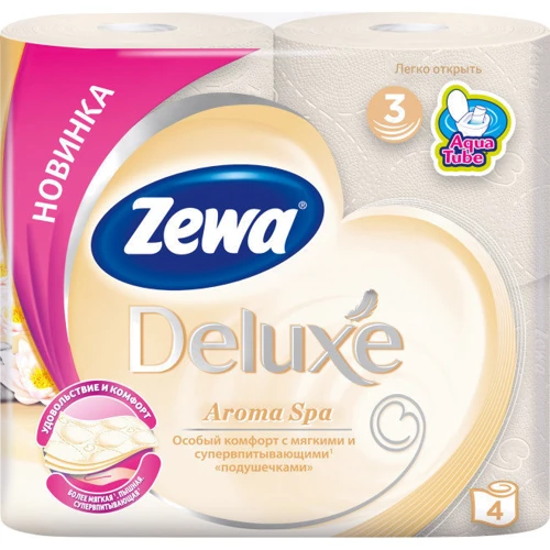 Тришаровий туалетний папір Zewa Deluxe Aroma Spa - м'яка і міцна, якісний туалетний папір з легким ароматом ароматичної олії для щоденного догляду. Нові вбираючі "подушечки" делікатно очищають шкіру і ніжно піклуються про неї, а унікальна втулка Aqua Tube розчиняється в воді.