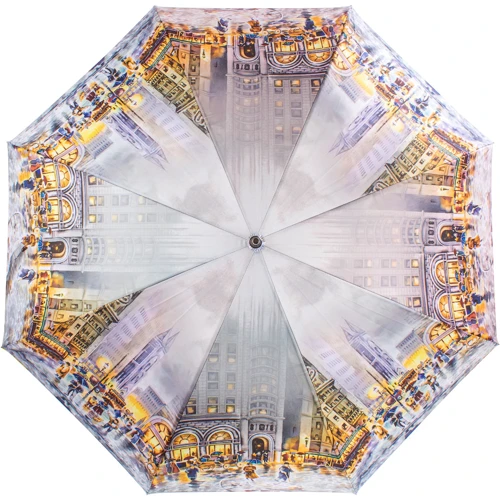 Зонтик в виде трости – вещь презентабельная по определению. Эта же модель торговой марки ZEST оформлена столь тщательно и изготовлена так мастерски, что выглядит просто безупречно. Высокий купол и длинный наконечник, точная форма ручки-крюк, туго натянутая полиэстеровая ткань под сатин, которая обладает модным и практичным «мокрым» эффектом, - каждая деталь образа нацелена на то, чтобы аксессуар запомнился и прослужил долго. Городские пейзажи на просторных секторах выполнены тоже очень интересно – фигуры людей отлично видны при взгляде на изделие сбоку, а уходящие вверх этажи зданий словно растворяются и образуют своеобразный узор на основной части купола.