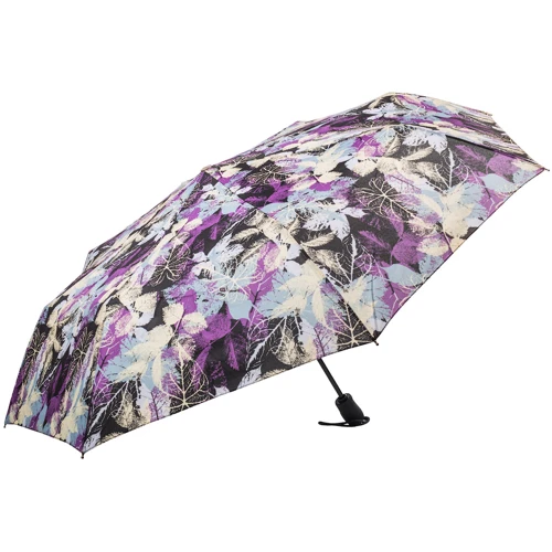 Оригінальність дизайну цього жіночого парасольки проявляється крізь … опале листя. Принт такого «змісту» заповнює всі сектори, він дивує, а потім відразу зачаровує кольоровою гамою. У ній замішані фіолетовий і бузковий відтінки, і одне це створює атмосферу таємничості і незаяложені краси. Додавання синіх і блакитних фарб помітно освіжає ансамбль, а просвічує чорний фон допомагає всім кольорам проявити себе якнайкраще. Ніжності образу додають «каркасні» зображення окремих листочків, і вся ця мальовнича абстракція нагадує про ті дні, коли так приємно бродити по алеях парку в дощовий тихий день. Втім, якщо Ви опинитеся на вулиці під час зливи з поривами вітру, аксесуар марки AIRTON надійно вкриє Вас від негоди.