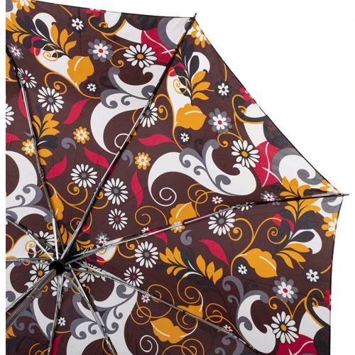 Яскравий і барвистий, динамічний образ створили майстри марки АЕРТОН, що випустили цей жіночий парасольку. При цьому в якості фонового кольору вони використовували насичений, природний коричневий, який, як відомо, - один з найбільш універсальних по сумісності з іншими фарбами. Так що бордово-червоні, оранжево-жовті, білі елементи абстрактного принта виглядають виразно-контрастно, квіткова основа малюнка гармонує з фоном. Складаний аксесуар оснащений ергономічною ручкою, яка виглядає відмінно і відразу переконує в своїй комфортності - вона округла і пряма, має матову не слизька поверхня. Система автомат працює бездоганно в міцному каркасі зі сталі, де зі склопластику виготовлені кінцеві ділянки антіветрових спиць.