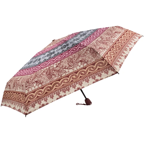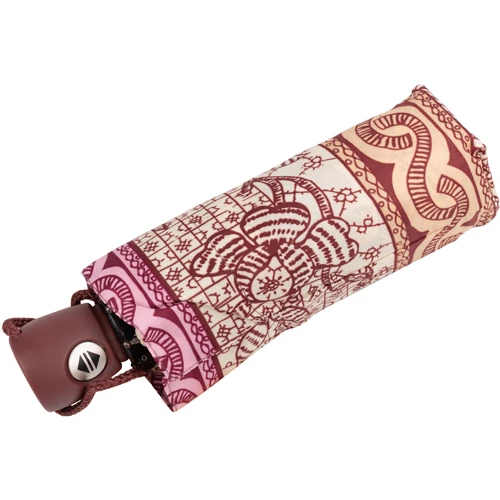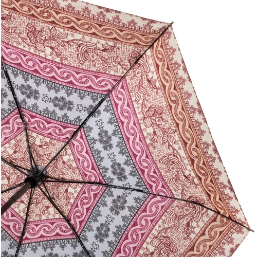 Комбінація вигадливих візерунків на куполі цього парасольки створює цікавий набір фігур і мотивів. Окремі «епізоди» розташовуються по горизонтальних лініях різної ширини. Монохромна бежева колірна гамма сусідить з ділянками, в яких домінують рожеві або блакитні відтінки. Об'єднуючим елементом принта виступають тонкі смужки, якими промальовані всі частини малюнка. Безліч дрібних деталей, оригінальність дизайну і універсальна забарвлення роблять аксесуар торгової марки AIRTON дуже привабливим для жіночого гардероба. Образ доповнюється ергономічною ручкою, яка допоможе з комфортом користуватися кнопкою системи автомат.
