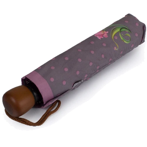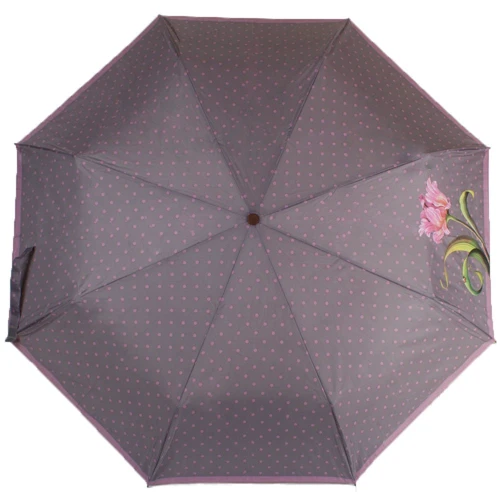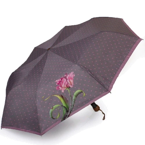 Парасолі-напівавтомати займають середню позицію між простий механікою і повністю автоматичними аксесуарами, їх охоче вибирають покупці за зручність і високу надійність. Дана модель теж оснащена напівавтоматичним механізмом, який приводиться в дію великий кнопкою на ручці. Основна частина ручки виготовлена з натурального дерева і її колір красиво перегукується з сірим фоном купола і рожевим кольором малюнка. Співвідношення відтінків тут передбачувано і виглядає спокійно, врівноважено, воно доповнено однієї не надто яскравою, але великої деталлю - зображенням тюльпана.
