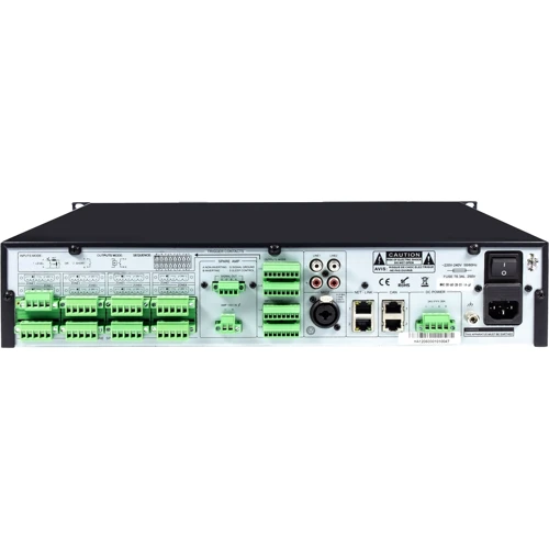 Возможно подключение громкоговорителей по 3- и 4-проводным линиям. Усилитель взаимодействует с главным контроллером системы через локальную сеть для трансляции сообщений эвакуации EVAC и фоновой музыки. Для подключения локальных источников звука усилитель имеет вход для подключения микрофона для экстренных сообщений на лицевой панели, обычный микрофонный вход и 2 линейных входа. Приоритеты всех доступных входов могут настраиваться пользователем. Усилитель имеет 8 триггерных входов и 8 выходных релейных триггеров, каждый из которых может программироваться.
