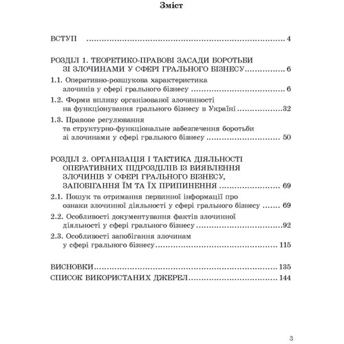 Монографія присвячена теоретико-правовим і організаційно-тактичним засадам запобігання злочинам у сфері грального бізнесу, їх виявлення та припинення. В роботі надано оперативно-розшукову характеристику злочинів у сфері грального бізнесу, встановлено та класифіковано пошукові ознаки таких злочинів у взаємозв’язку з технологіями злочинної діяльності. Запропоновано алгоритм документування злочинів у сфері грального бізнесу через визначення алгоритмічної матриці дій спеціальних робочих груп з відпрацюванням інформації, яка надходить до оперативних підрозділів.